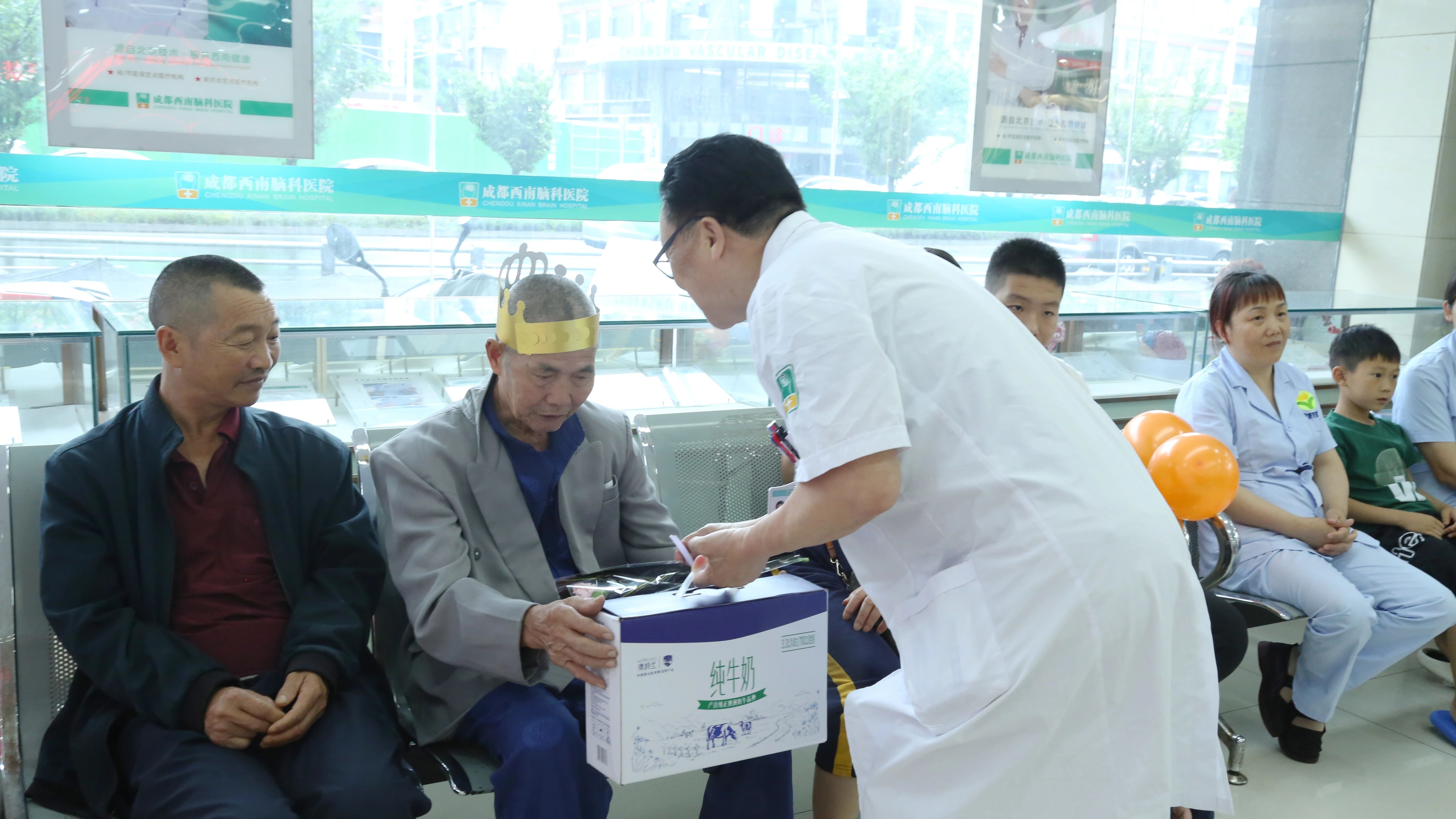 随后,胥院长亲自为每位寿星送上了一箱牛奶和一束鲜花。寿星们接过礼物,脸上露出了感激的笑容。