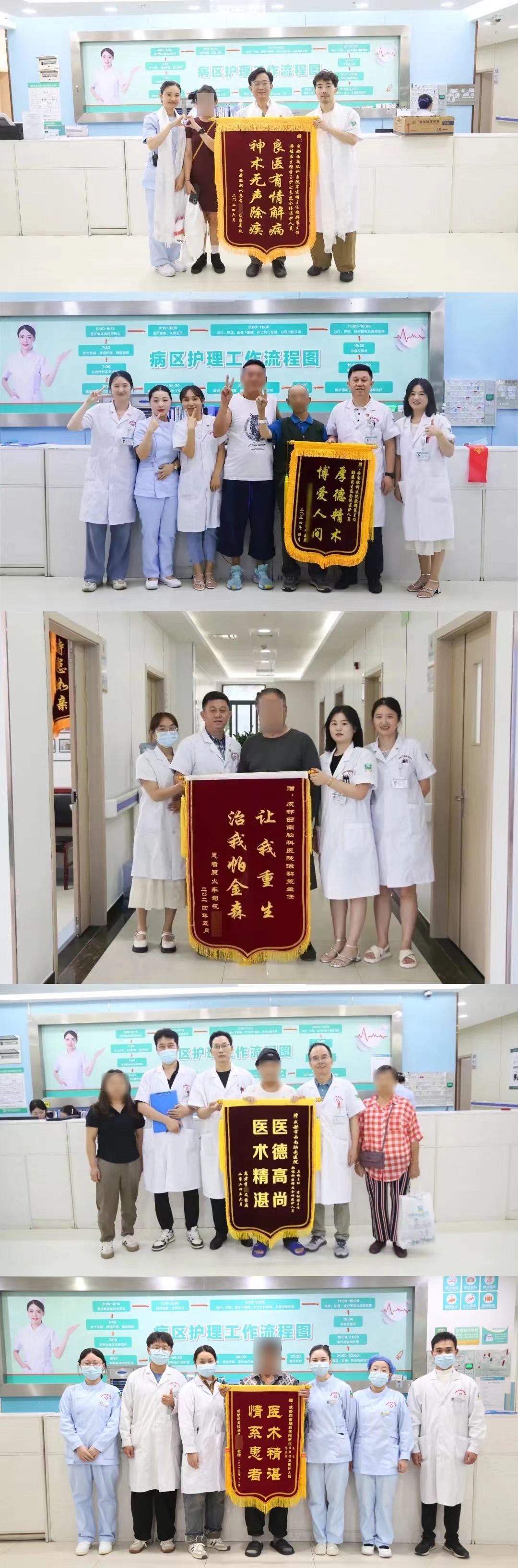 “用技术服务患者,用关爱感动患者”是西南脑科医护人员始终秉承的服务理念。一面面鲜红的锦旗也激励着全科医护工作者永葆初心,牢记使命,努力打造医德高尚、技术过硬、服务优质的医护团队,为广大人民群众健康保驾护航。